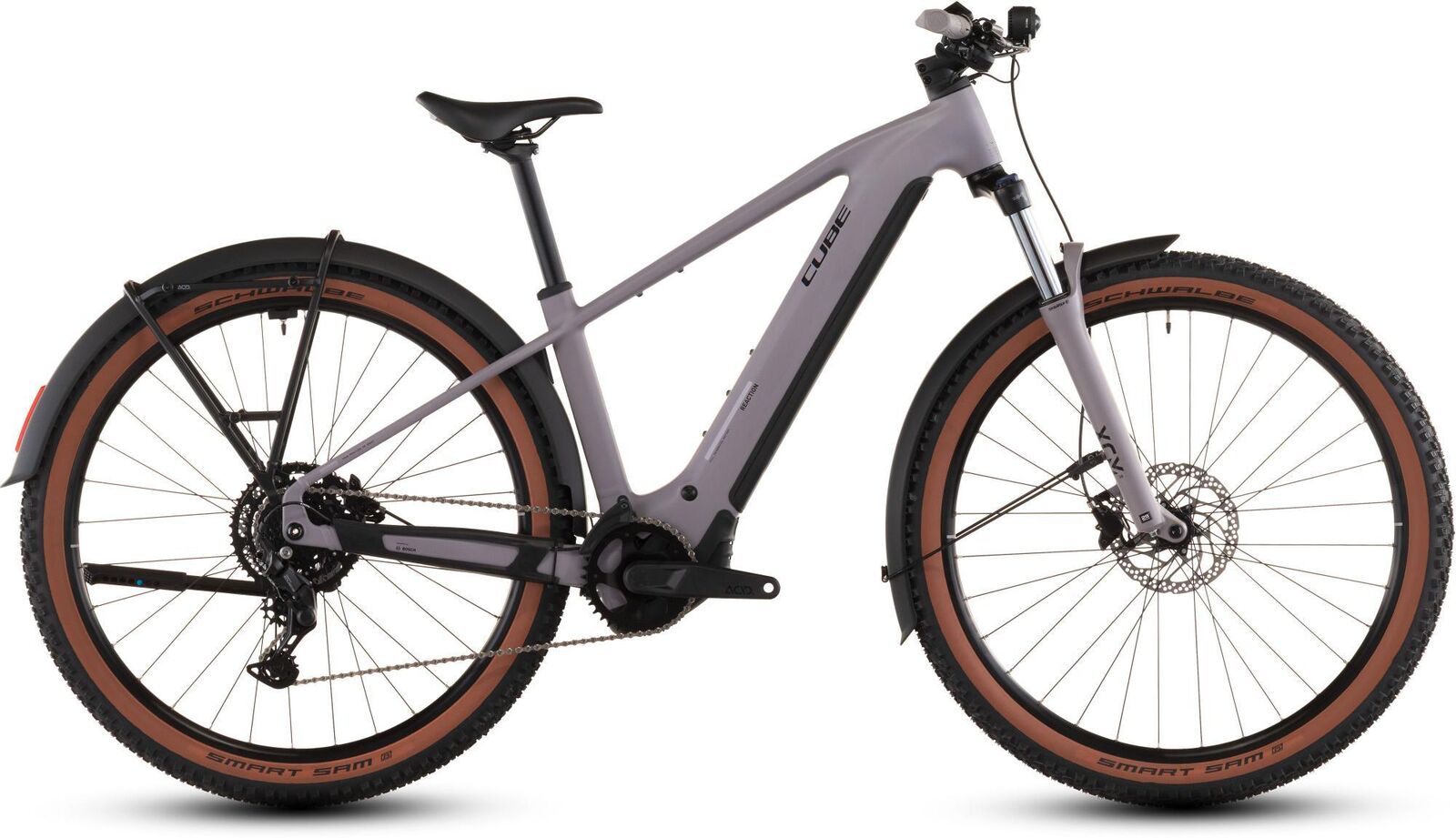 | Description | 1980s cycle couriers adopted the mountain bike for the urban jungle with good reason - and we've channelled that spirit of versatility into the Reaction Hybrid Performance FE. Bosch's powerful Performance motor - with a 600Wh battery - and easy-shifting Shimano Cues 9-speed gears keep you moving and powerful Shimano hydraulic disc brakes ensure you can always stop safely whatever the weather. There's a suspension fork with 120mm travel (100mm for smaller frame sizes) for tackling city potholes and rooty trails grippy Schwalbe Smart Sam 2.6in tyres and a comfy saddle and grips for day-long comfort. Fully equipped with mudguards integrated lights a luggage carrier and a kickstand it's all set for adventure - anytime anywhere. The Reaction Hybrid Performance FE is built for all-round versatility whether you're tackling the daily commute or peaceful forest trails. Bosch's quiet powerful Performance motor with 75 Nm torque is Smart System-equipped and there's a 600Wh battery for miles of pedal assistance. We fitted mudguards a luggage carrier a lighting set and a flat mount kickstand so you're all set for any journey. There's even mounting points for a lock or multi-tool under the top tube while Internal Cable Routing reduces clutter and flatters the frame's elegant lines. And with Size Split it's easy to find the perfect fit for you. Frame: Aluminium Superlite Gravity Casting Technology Agile Ride Geometry Boost148 Fully Integrated Battery Advanced Internal Cable Routing 1.5 Headtube Kickstand/Fender/Carrier Mounting Points Fork: SR Suntour XCM34 NLO Coil Tapered 15x110mm 120mm (27.5: 100mm) Headset: ACROS AZF-1034 ICR (Integrated Cable Routing) Top Zero-Stack 1 1/2" (ZS 56mm) Bottom Zero-Stack 1 1/2" (ZS 56mm) X-Connect Interface Stem: CUBE Performance Stem E-MTB 35 FPI-Link Handlebar: CUBE Rise Trail Bar 35 Grips: ACID Hybrid Perform Rear derailleur: Shimano Cues RD-U4000-GS 9-Speed Chain guide: Reverse Flip-Guide E-Chain Guide Direct Mount I-Plate Shifters: Shimano Cues SL-U4010- Rapidfire-Plus Brake system: Shimano BR-MT200 Hydr. Disc Brake (180) Crankset: ACID MTB Hybrid Pro 38T Crankset chainring sizes: 38T Cassette: Shimano Cues CS-LG300 11-46T Number of gears: 9 Chain: KMC eGlide Wheelset (system wheels): ACID Pro 30 32/32 Spokes 15x110mm/12x148mm Tubeless Ready Tires: Schwalbe Smart Sam Active 2.6 Pedals: ACID PP Trekking Saddle: ACID Sequence 160 Seat post: CUBE Performance Post 31.6mm Front light: ACID Front Light PRO-E 150 X-Connect 12V DC Rear light: ACID Mudguard Rear Light PRO-E 12V DC Kickstand: ACID FM Pure Kickstand Mudguard: ACID 85 BB-Mount Bell: Knog Oi Carrier: ACID Carrier SIC 2.0 Rail Boost Engine: Bosch Drive Unit Performance Line 75Nm (BDU34) Battery: Bosch PowerTube 600 Charger: Bosch 2A Remote: Bosch Purion 200 with Integrated Display |
