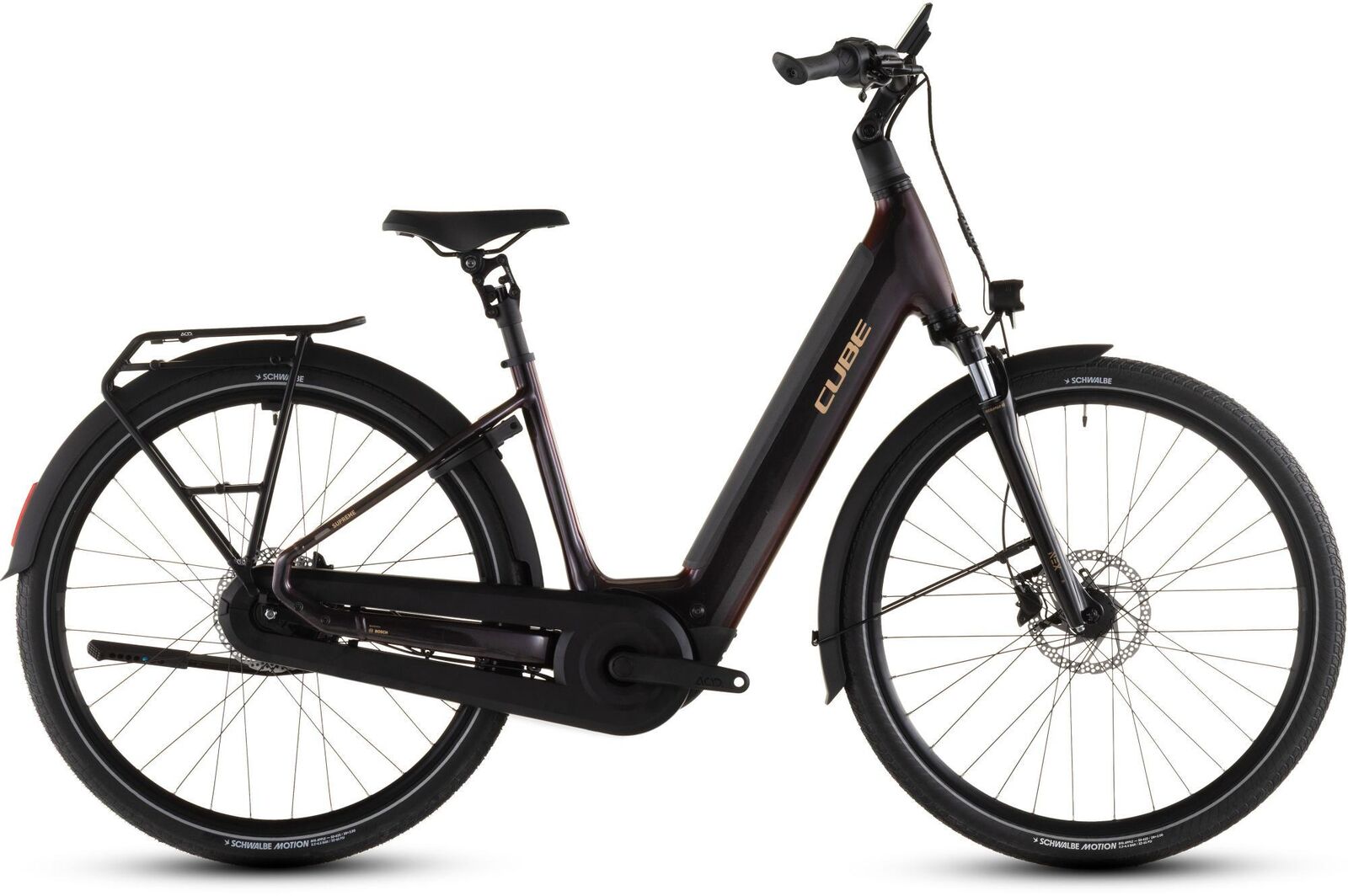 | Description | A bicycle should be simple adaptable and easy to live with. The Supreme Hybrid Comfort Pro's elegant Easy Entry frame - with a wide range of frame sizes so everyone can find their perfect fit - is just the start. Super easy-to-use Enviolo Trekking stepless hub gears work with the Bosch Performance PX drive and 600Wh PowerTube battery to propel you towards your destination. With up to 90Nm of pedal assistance on top you'll be there sooner than you think. Strong Shimano hydraulic disc brakes and grippy fast-rolling Schwalbe 50mm tyres provide safe stopping in all weathers while the full-length mudguards help keep you drier and cleaner. With the adjustable stem comfortable parallelogram suspension seatpost Semi Integrated Carrier 2.0 lighting set and kickstand all included you've everything you need. Frame description The devil is always in the detail. With the Supreme Hybrid frame Bosch's Performance PX motor provides quiet and smooth pedal assistance up to 90Nm. The 600Wh Bosch PowerTube battery is stowed neatly inside the down tube while Smooth Welding complements the frame's clean almost organic lines. Integrated Cable Routing and X-Connect keep wires and cables out of sight and out of harm's way. There's a wide range of sizes from 42cm to 58cm so everyone should be able to find their ideal fit. The Semi-Integrated Carrier 2.0 is equal parts neat and sturdy giving you a solid platform on which to carry... well whatever you need. And we added mudguards a full lighting system and a kickstand so you really are all set. The devil is always in the detail. With the Supreme Hybrid frame Bosch's Performance PX motor provides quiet and smooth pedal assistance up to 90Nm. The 600Wh Bosch PowerTube battery is stowed neatly inside the down tube while Smooth Welding complements the frame's clean almost organic lines. Integrated Cable Routing and X-Connect keep wires and cables out of sight and out of harm's way. There's a wide range of sizes from 42cm to 58cm so everyone should be able to find their ideal fit. The Semi-Integrated Carrier 2.0 is equal parts neat and sturdy giving you a solid platform on which to carry... well whatever you need. And we added mudguards a full lighting system and a kickstand so you really are all set. Frame: Aluminium Superlite Comfort Ride Geometry Premium Comfort And Safety Semi-Integrated Carrier Fully Integrated Battery Advanced Internal Cable Routing Fork: SR Suntour NEX-E25 NLO 50mm Headset: ACROS AZF-1035 ICR (Integrated Cable Routing) Top Zero-Stack 1 1/2" (ZS 56mm) Bottom Zero-Stack 1 1/2" (ZS 56mm) HIC Stem: CUBE Comfort Stem Pro 31.8mm Adjustable Handlebar: CUBE Comfort Shape Bar Grips: ACID Travel Comfort Gripshift Shifters: Enviolo MC-TWIST Brake system: Shimano BR-MT200 Hydr. Disc Brake (180) Crankset: ACID Trekking Hybrid 38T Crankset chainring sizes: 38T Gear Teeth: KMC HG 9-Spline 19T Number of gears: 999 Chain: KMC Z610 Rims: CUBE EX25 32H Disc Tubeless Ready Front hub: Shimano HB-QB400 QR. 6-Bolt Rear hub: Enviolo Trekking 380% 6-Bolt 135mm Tires: Schwalbe Motion Big Apple PerfL RaceGuard 50-622 Pedals: ACID PP Trekking Saddle: ACID Shen Pro Seat post: SR Suntour NVX 31.6mm Seat post = dropper Yes/No: NO Front light: ACID Front Light PRO-E 60 X-Connect 12V DC Rear light: ACID Mudguard Rear Light PRO-E 12V DC Kickstand: ACID FM Pure Kickstand Mudguard: ACID 50 BB-Mount Bell: Reich Cycle Bells Ringsound Carrier: ACID SIC 2.0 RILink Engine: Bosch Drive Unit Performance Line PX max. 90Nm (BDU34) Battery: Bosch PowerTube 600 Charger: Bosch 2A Remote: Bosch LED Remote Display: Bosch Kiox 500 |