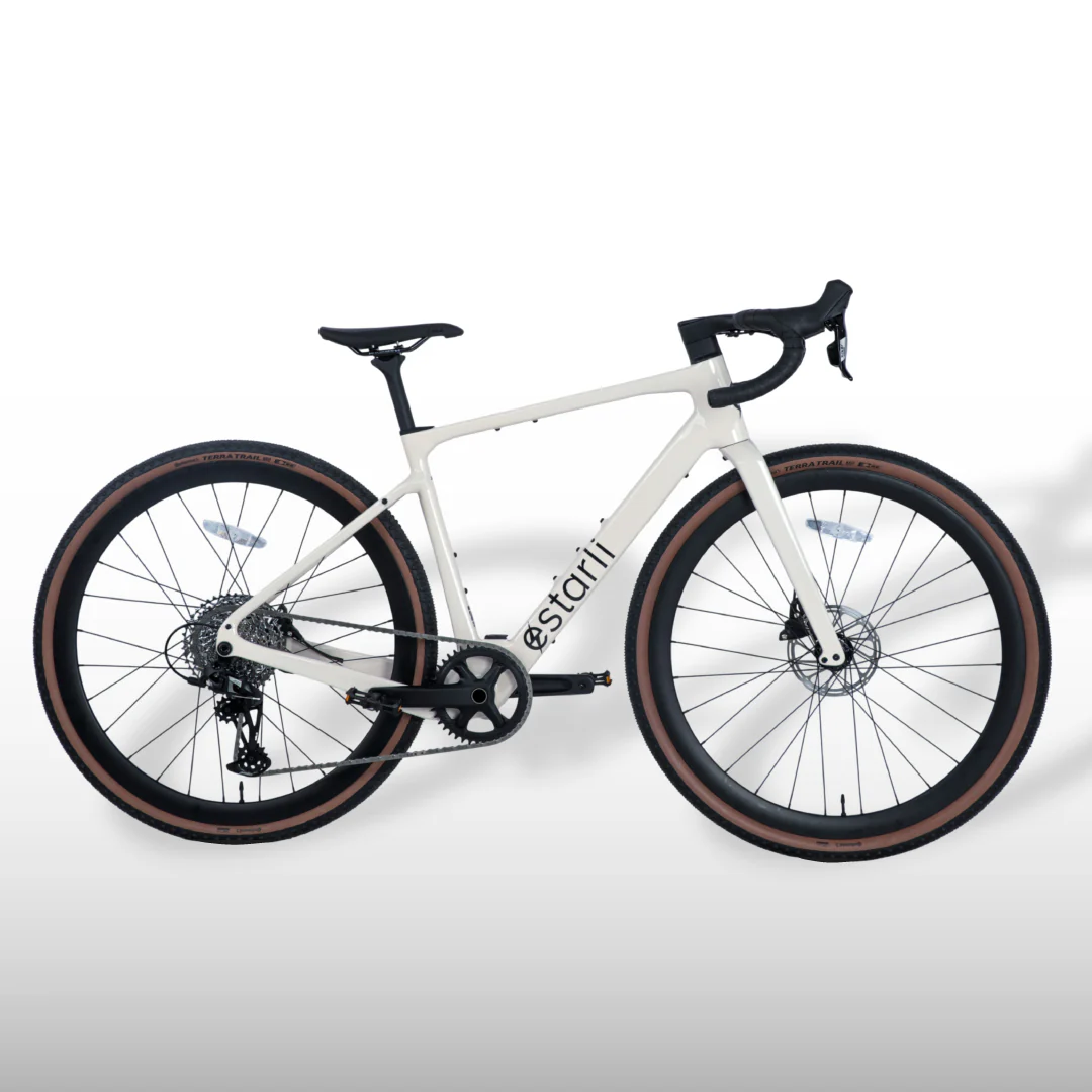 | Description | Key SpecificationsColours: Cosmic Purple / Lunar White Frame Layout: Gravel Rider Weight Limit: 110 kg Battery Capacity: 36 V 7 Ah / 250 Wh - " Samsung lithium-ion cells, compliant with EN 50604 e-bike battery safety standard Charge Time: Up to 3.5 hours Range: 40- "60 km / 25- "40 miles Assist Limit: 15.5 mph / 25 km/h Handlebars: Carbon integrated cockpit Display: Centrally mounted, out-front Weight: 13.5 kg Warranty: 2 years Drivetrain: 12-Speed SRAM Apex / Rival derailleur & shifters ?? Technical DetailsFrame: Carbon Fibre T700 Fork: Rigid carbon Gearing Options: 11 - " 44 T Brakes: SRAM Apex Hydraulic Tyres: 700C ? - 45 Hub Motor: Estarli Cycle Systems (CSG 4.0 T), with integrated torque sensor (40 Nm) |