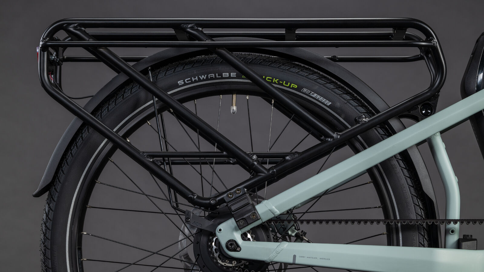 Our cargo-carrying Longtail Hybrid is built with practicality in mind. Powered by Bosch's capable and smooth Cargo Line motor and 800Wh battery it's designed to handle a load of up to 200kg in total. A weight of 60kg can be carried on the sturdy extended rear carrier which can accept two standard pannier bags per side and features elastomer suspension. There's even a lockable storage compartment for smaller items in the down tube. Need more load-carrying versatility? No problem. Optional accessories include an extension to allow the fitting of a standard Eurobox a headset-mounted front carrier and a down-tube carrier. Whatever you need to carry and wherever you need to carry it to the Longtail Hybrid will help you get it there.