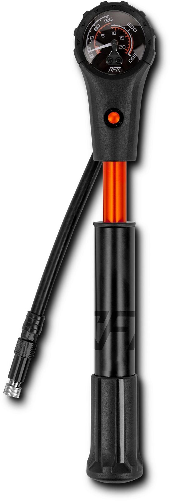 | Description | long flex hose with metal Schrader valve and Presta valve adapter 1.5" industrial pressure gauge aluminium pump with two-stage pump system switch between high volume and high pressure air release valve includes bracket 300 psi max. / 20 bar max. Under pressure! Keep your entire set-up dialled on the trail with the Shock&Tire from RFR - ideal for full-suspension and hardtail mountain bikes. The shock pump's patented Schrader head with Presta adapter and a long flex-hose guarantee maximum flexibility. Choose between high pressure and high volume depending on what's attached to the other end of the hose! Fine adjustments are a cinch courtesy of the air release valve and pressure gauge! |